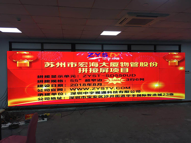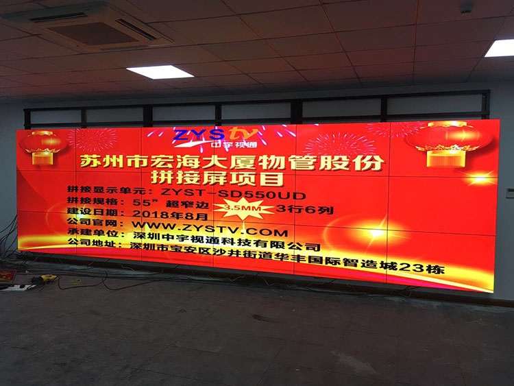 蘇州市宏海大廈物管股份55寸超窄邊拼接屏項目選擇中宇視通科技的拼接方案,項目安裝調(diào)試完成并且順利驗收,中宇視通科技全體職工從深圳發(fā)來賀電!