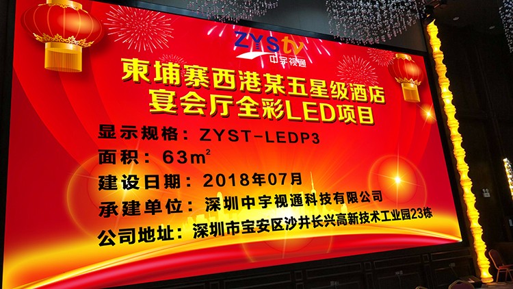 柬埔寨西港某五星級酒店與中宇視通科技合作,宴會廳63平方P3全彩LED顯示屏項目安裝完成,整屏點亮并驗收完成。